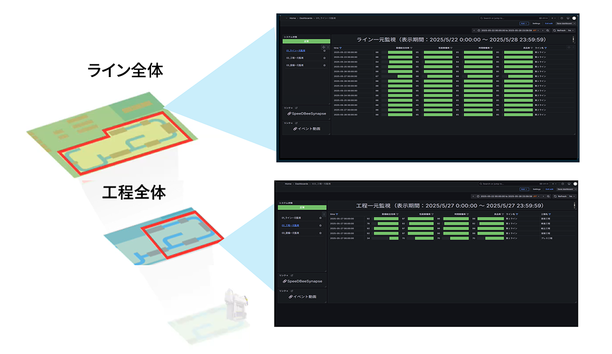 「工場監視パッケージ」では、収集したデータを基に工程単位・ライン単位のKPI(OEE、性能稼働率、時間稼働率、良品率)を自動算出します。 算出結果は、同一ダッシュボード上に、色分けした視認性に優れた形式に整理して表示します。異常や低下傾向など対処すべき課題を一目で把握し、問題を抱えたラインを迅速に特定可能です。