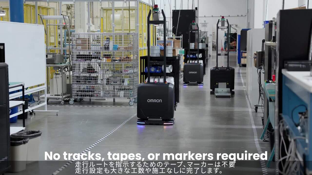 低床設計と一体型リフト、全方向移動により、台車をそのまま持ち上げて搬送し、取り出し・再配置・並べ替えまで対応。床置き搬送の自動化を実現します。(7分27...